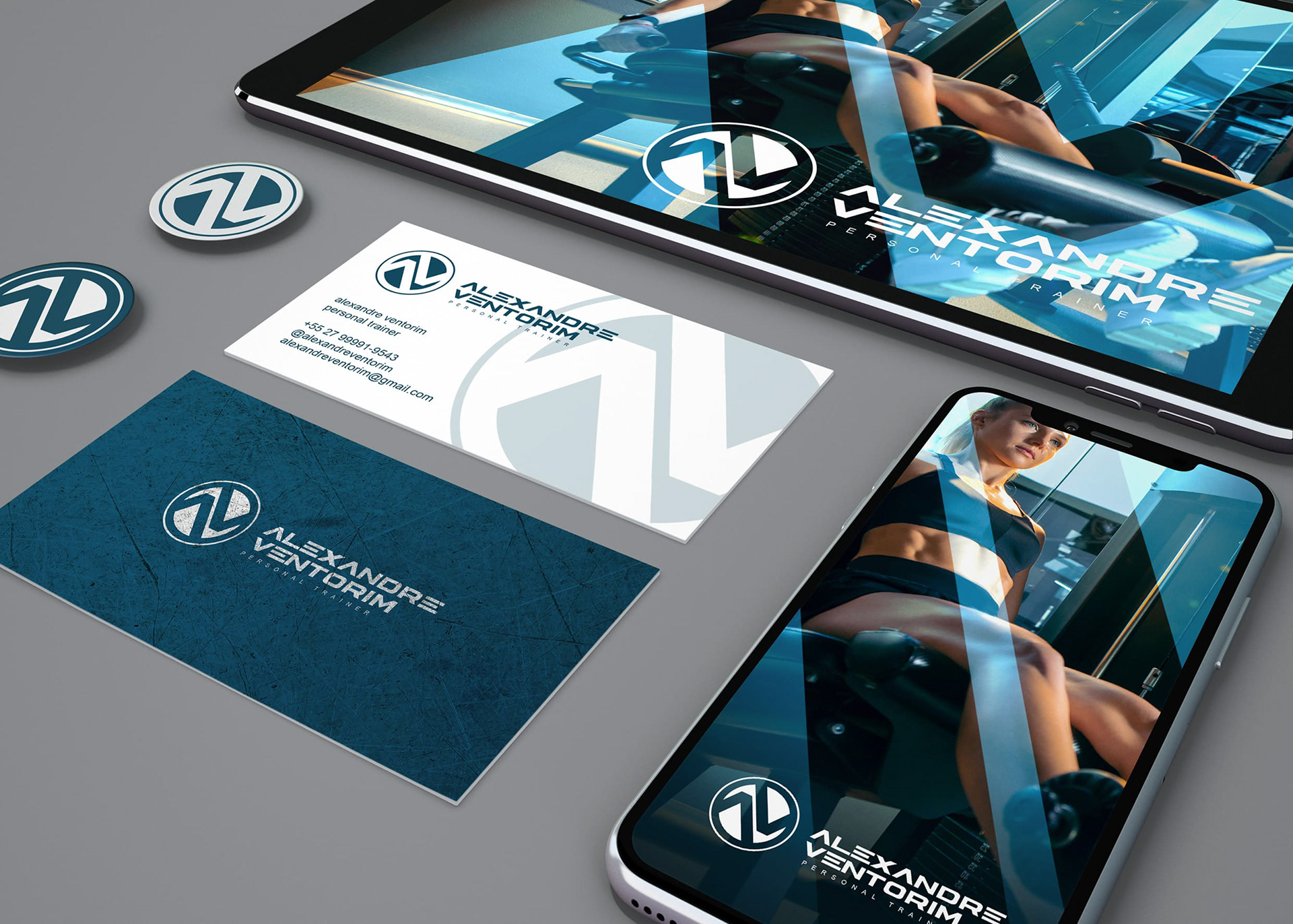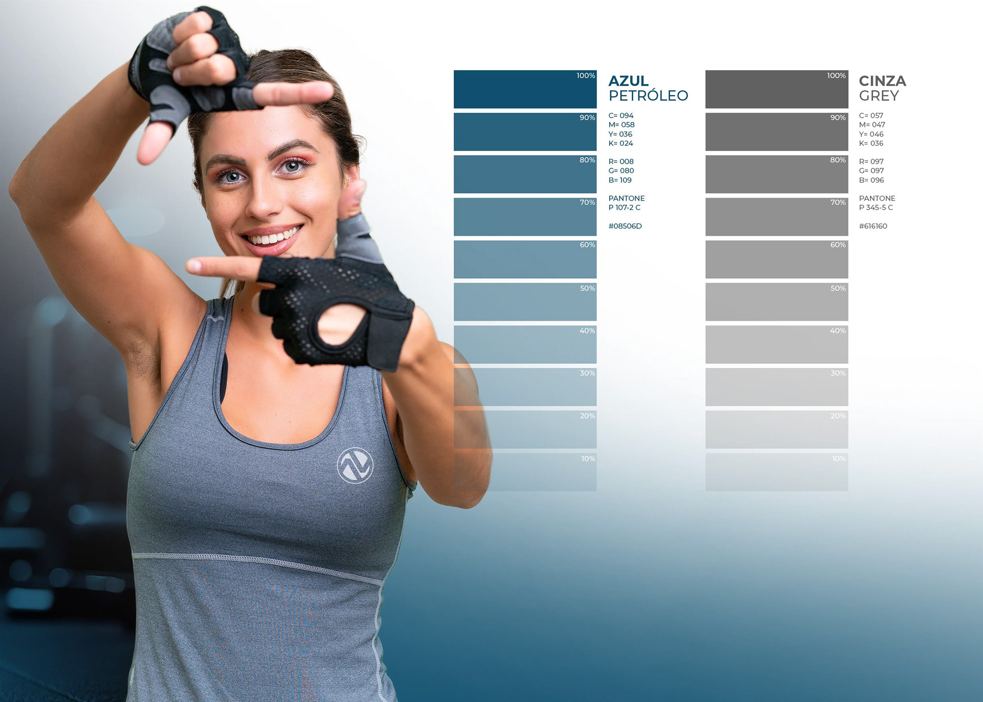 A cor azul petróleo é uma excelente escolha para a identidade visual de um personal trainer. Ela transmite confiança e segurança, além de estar associada ao bem-estar. No marketing, é utilizado para transmitir a ideia de qualidade e saúde, características ideiais para um profissional da área fitness. O cinza grey está associado a qualidades como maturidade e estabilidade, profissionalismo e seriedade, características essenciais para conquistar a confiança