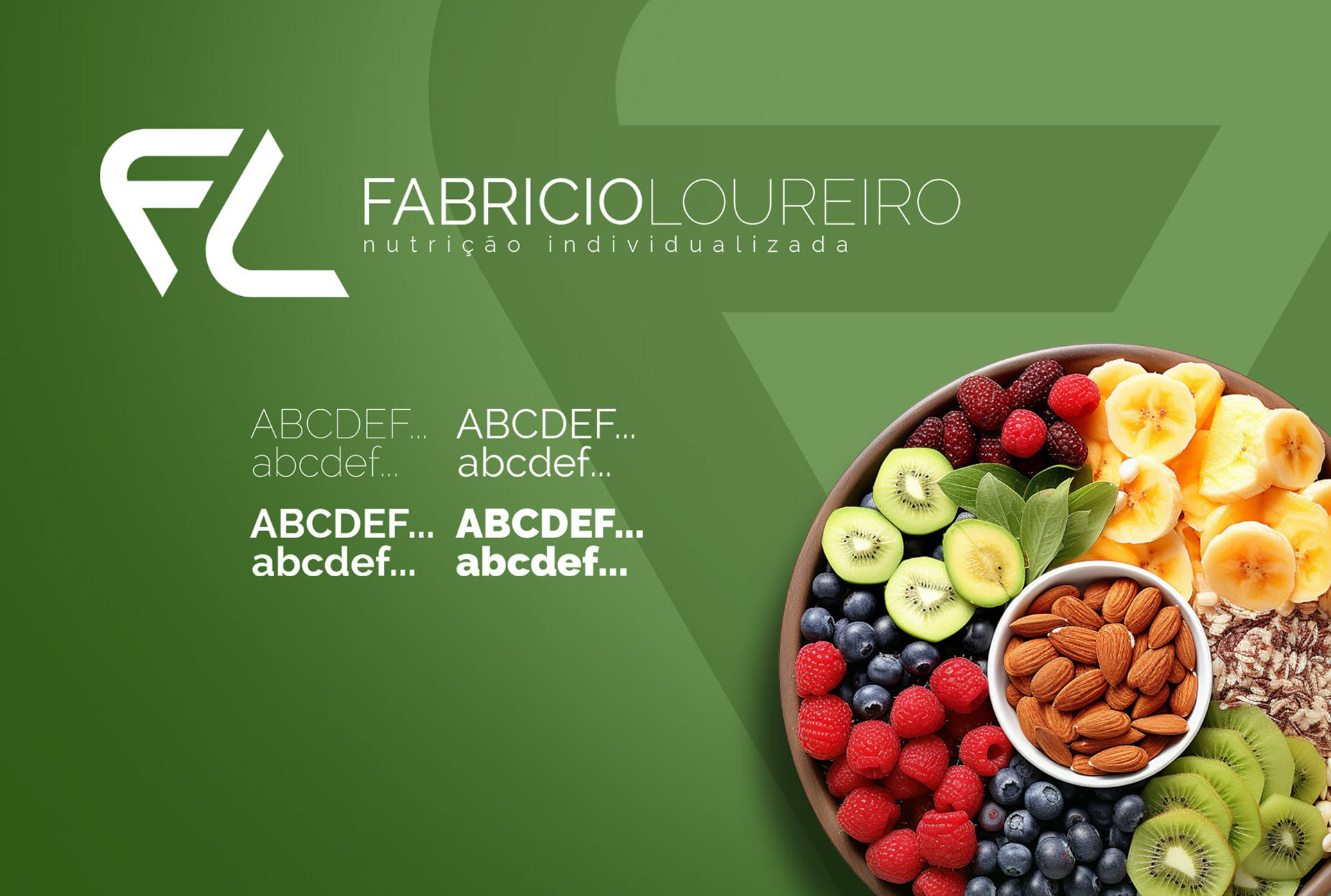 Para a tipografia, foi explorada a font Ralewey, uma fonte com design moderno e sofisticado, que transmite a ideia de profissionalismo e atualização constante. Essas características são essenciais para um nutricionista que busca se conectar com um público exigente que transita entre jovem e adulto.